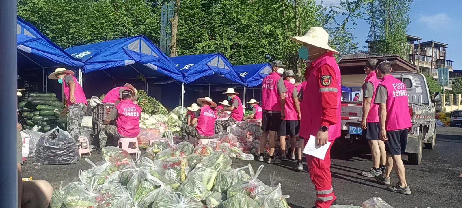 在當(dāng)?shù)匾咔榉揽刂笓]部的帶領(lǐng)下,王成勇、祝長青,身披“志愿紅”,深入封控區(qū)域,從晨光熹微到燈火闌珊,一整天都是后背全濕,每一天都是腰酸背痛。但他們明白,“哪里需要就沖向哪里”。二人先后9次進(jìn)入高風(fēng)險區(qū)搭建應(yīng)急帳篷,為的是這一頂頂帳篷能夠為來自四面八方、各行各業(yè)的志愿者們遮風(fēng)擋雨,每天一趟趟一袋袋的蔬菜、肉、米、油,讓當(dāng)?shù)鼐用衽c游客每天都能夠安心避疫。