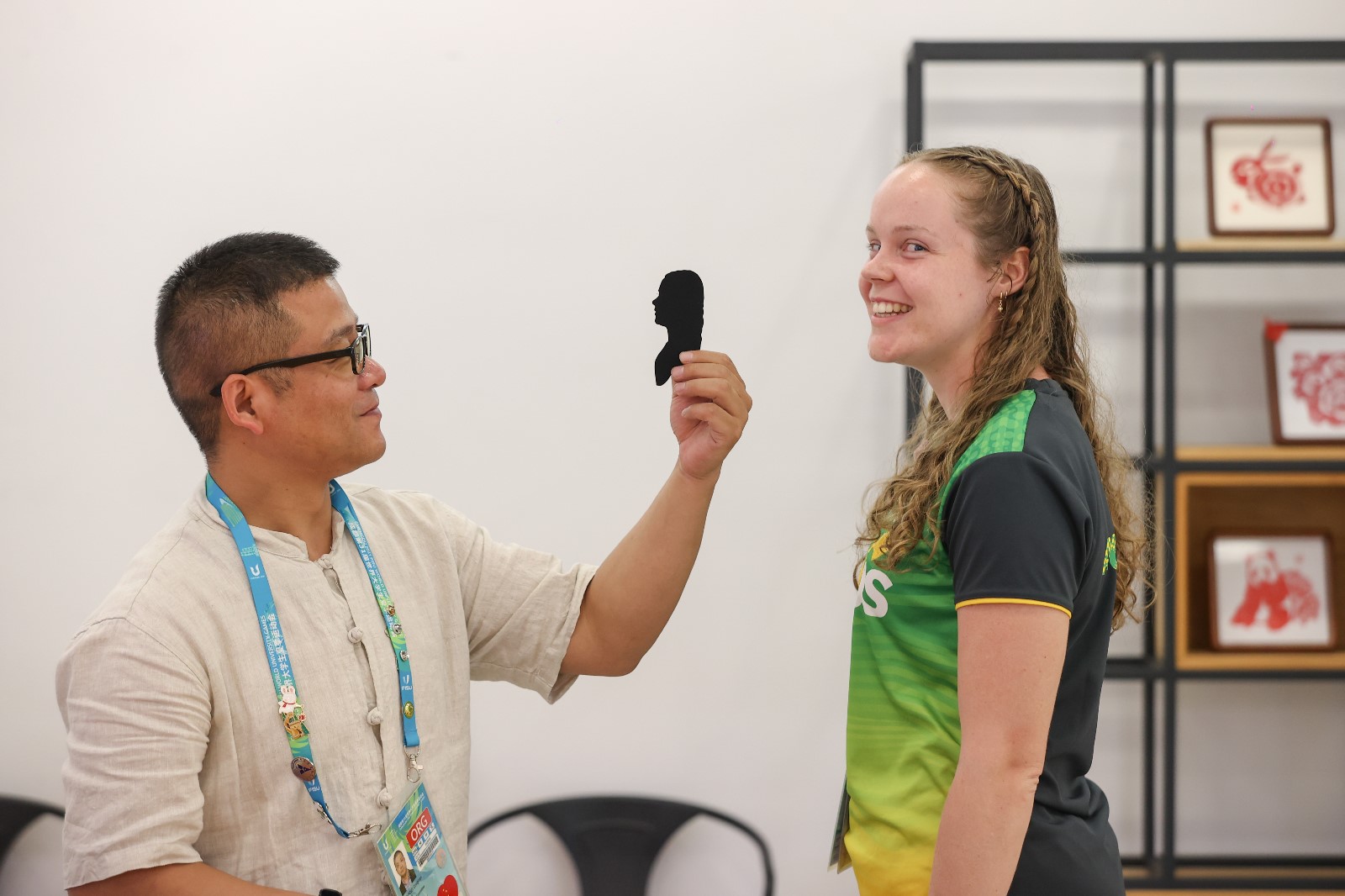 莊叢燦的剪影作品和其耐心負(fù)責(zé)的剪紙教學(xué)倍受運(yùn)動員們“點(diǎn)贊好評”的同時,也吸引了國際大體聯(lián)和各國代表團(tuán)人員前來“沉浸式體驗(yàn)”。期間,莊叢燦為國際大體聯(lián)代理主席雷諾·艾德和意大利代表團(tuán)官員彼得羅·伊瓦爾迪進(jìn)行剪紙教學(xué)和剪影留念。