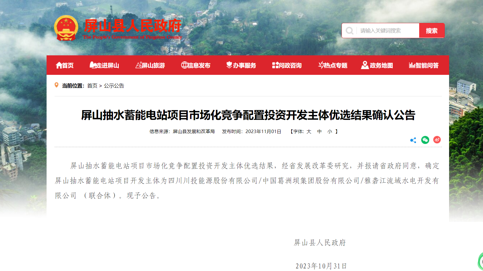 11月1日,宜賓市屏山縣人民政府發(fā)布《屏山抽水蓄能電站項目市場化競爭配置投資開發(fā)主體優(yōu)選結果確認公告》,四川川投能源股份有限公司、雅礱江流域水電開發(fā)有限公司、中國葛洲壩集團股份有限公司組成的聯(lián)合體成功中標。該項目是川投能源貫徹習近平總書記來川視察重要指示精神,以高質量主題教育成效推動企業(yè)高質量發(fā)展的新成果,是深入貫徹落實省委十二屆三次全會精神,加力推進新型工業(yè)化的新體現(xiàn),是推進“五區(qū)共興”的新?lián)?,是落實川投集團“1+3”產業(yè)發(fā)展戰(zhàn)略的新作為,實現(xiàn)了在抽水蓄能領域、自主開發(fā)百萬千瓦級電站領域“雙破題”!