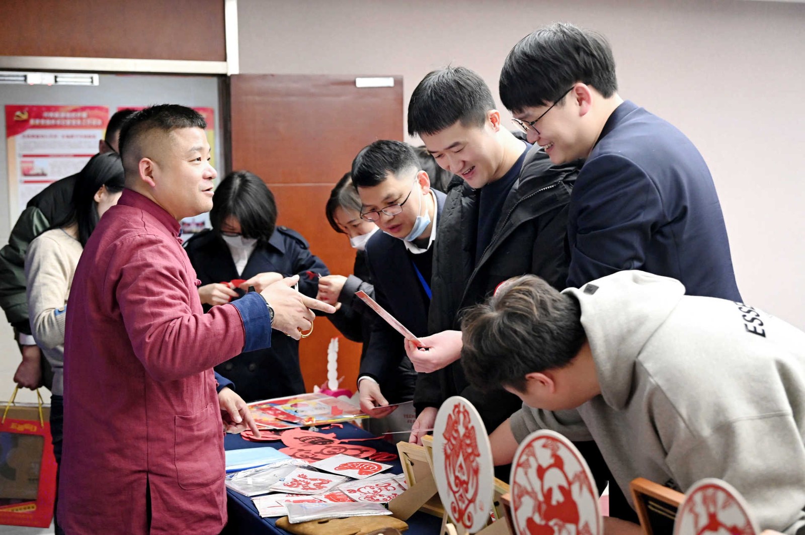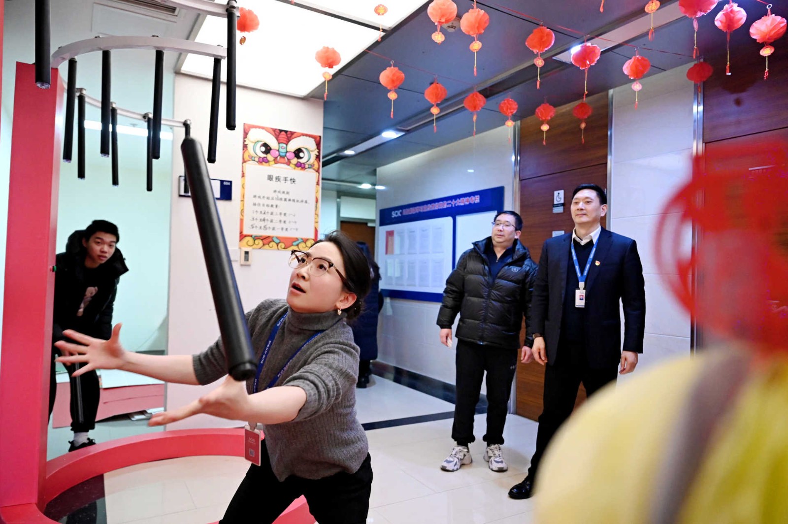 此次活動采用游園方式,現(xiàn)場設(shè)置了民俗體驗區(qū)、非遺手作區(qū)、民俗體驗區(qū)、新春互動區(qū)、游戲互動區(qū)等5個活動區(qū)域,涵蓋猜燈謎、剪窗花、做龍燈、滾滾樂等8個活動?;顒蝇F(xiàn)場每一處都用心裝扮,火紅的中國燈籠、精美的傳統(tǒng)對聯(lián)伴隨濃郁的新年味道彌散在會場的每一個角落。大家爭先恐后、玩勁十足,盡享新春的熱鬧與喜悅!有的圍著掛著紅線繩的燈謎卡片,仔細(xì)閱讀謎語,認(rèn)真思考,沉浸在猜謎的樂趣中;有的圍在四川剪紙非遺傳承人莊叢燦老師周圍,一邊聆聽著剪紙的技巧,一邊仔細(xì)修理邊角,用心精雕細(xì)琢;有的在學(xué)習(xí)制作龍燈,他們展現(xiàn)出極高的熱情和創(chuàng)造力,根據(jù)自己的想象,給龍燈增添了各種裝飾,如彩紙、亮片等,使得每個龍燈都獨具特色。