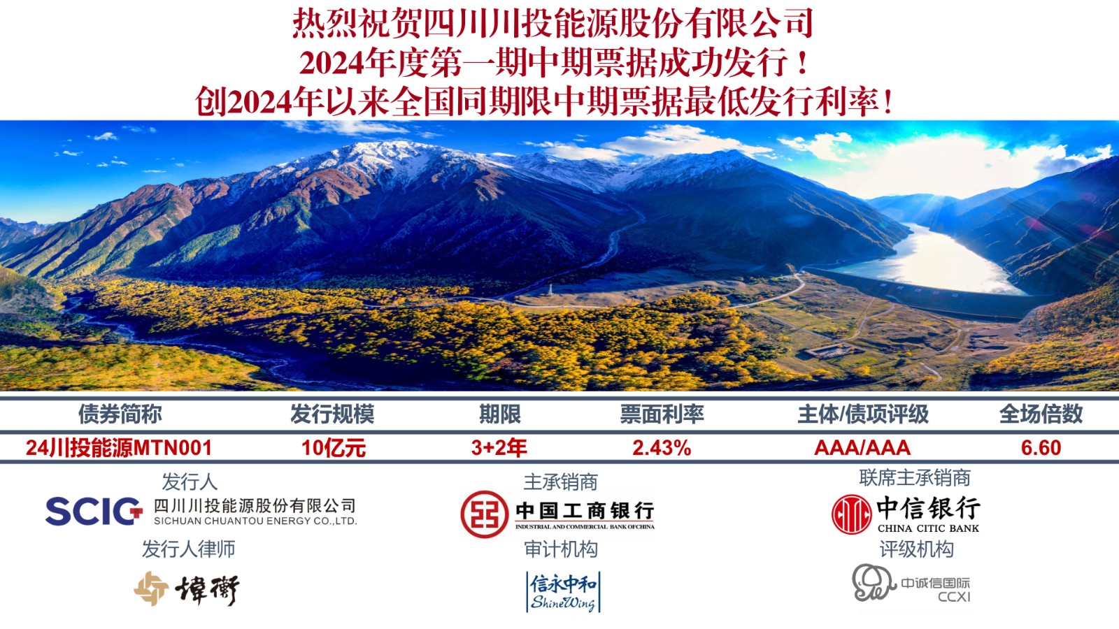 4月16日,川投能源搶抓資本市場有利時間窗口,成功發(fā)行2024年度第一期中期票據(jù)。本期中期票據(jù)發(fā)行規(guī)模為10億元,發(fā)行期限3+2年,發(fā)行利率2.43%,創(chuàng)2024年以來全國同期限中期票據(jù)最低發(fā)行利率,同時也創(chuàng)公司中長期債券歷史最低發(fā)行利率。