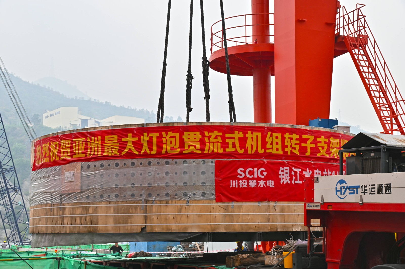 當(dāng)日上午,攀水電公司和參建單位職工齊聚壩頂,共同迎接歷經(jīng)艱難、遠(yuǎn)道而來的“重要成員”。據(jù)攀水電公司相關(guān)負(fù)責(zé)人介紹,該轉(zhuǎn)子支架具有設(shè)備巨大、運(yùn)輸困難、作用重要三個(gè)特征。設(shè)備之“重”。轉(zhuǎn)子支架直徑達(dá)8米,高2米有余,重達(dá)百余噸,是目前亞洲最大的燈泡貫流式機(jī)組轉(zhuǎn)子支架。運(yùn)輸之“難”。轉(zhuǎn)子支架于4月22日從江蘇鎮(zhèn)江碼頭開始運(yùn)輸,先乘船再坐車,途中克服了大件超寬超限、持續(xù)降雨、道路塌方等諸多不利因素,多次調(diào)整運(yùn)輸路線,風(fēng)雨無阻,日夜兼程,歷時(shí)66天,跨越7個(gè)省份,全程3062公里,在沿途交警的護(hù)送下安全抵達(dá)。作用之“要”。轉(zhuǎn)子支架作為機(jī)組的核心部件,為磁軛一體圓盤式結(jié)構(gòu),中心體采用整圓鍛鋼與磁軛圈焊接組成,對(duì)轉(zhuǎn)子磁軛垂直度、磁軛圓度等加工精度要求極高,決定著機(jī)組的運(yùn)行性能、運(yùn)行效率和安全穩(wěn)定性。
