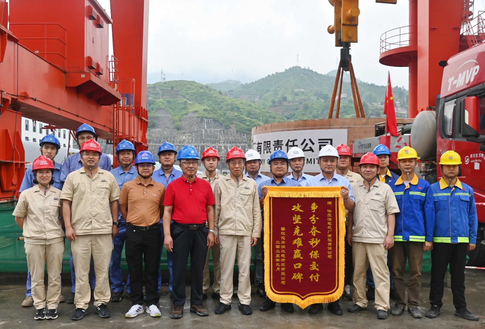 26日上午,現(xiàn)場各單位立即投入到吊裝前的準(zhǔn)備工作中。攀水電公司全程跟進(jìn)機(jī)電安裝進(jìn)展,逐一確認(rèn)安裝條件;施工單位技術(shù)人員按吊裝方案全面落實(shí)安全交底與技術(shù)措施,確保萬無一失;在各項(xiàng)準(zhǔn)備工作全面就緒的基礎(chǔ)上,6號機(jī)組的轉(zhuǎn)子支架平穩(wěn)、精準(zhǔn)吊裝就位。川投能源副總經(jīng)理、攀水電公司黨總支書記、董事長徐孝剛現(xiàn)場督導(dǎo)吊裝工作,充分肯定了哈電公司在本次極端條件下的運(yùn)輸成績,并向哈爾濱電機(jī)廠有限責(zé)任公司授予錦旗,感謝其長期以來對銀江水電站建設(shè)的大力支持。