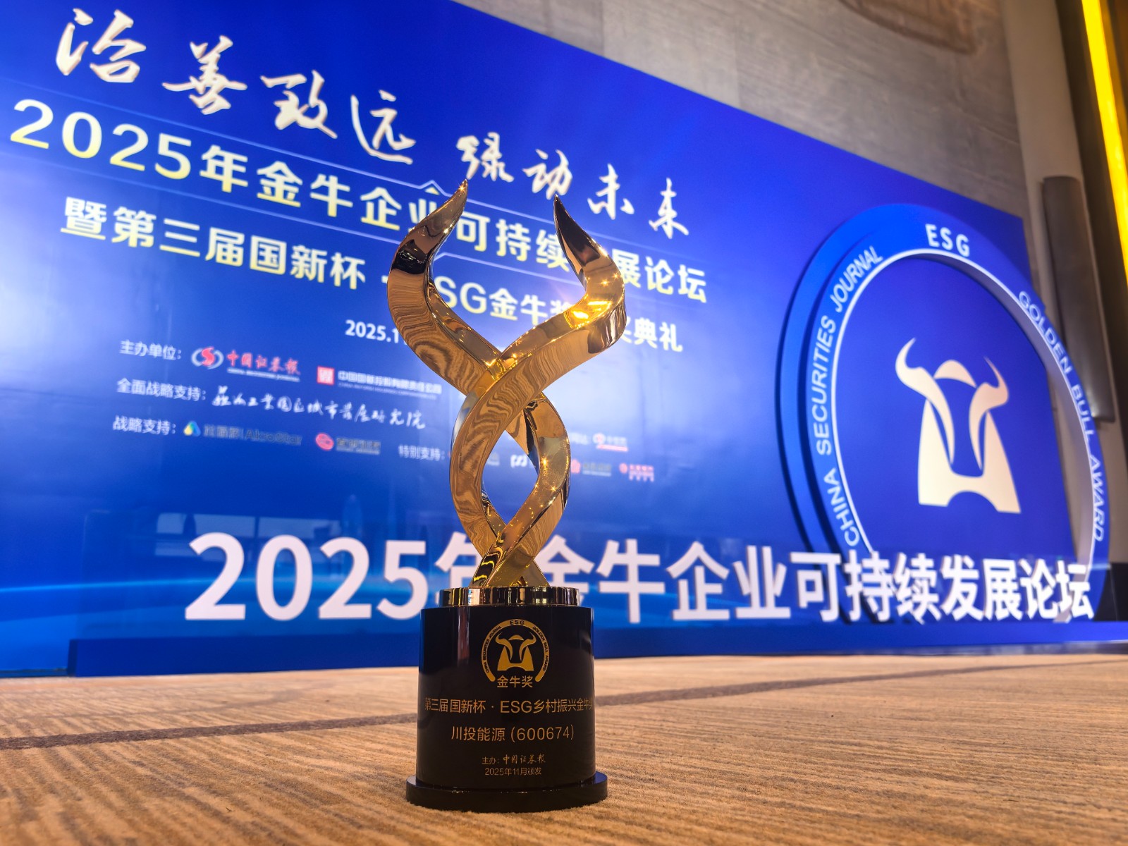 11月26日,由中國證券報主辦的2025年金牛企業(yè)可持續(xù)發(fā)展論壇暨第三屆國新杯·ESG金牛獎頒獎典禮在蘇州舉行,川投能源憑借在可持續(xù)發(fā)展領(lǐng)域的卓越表現(xiàn),榮獲“鄉(xiāng)村振興金牛獎”。