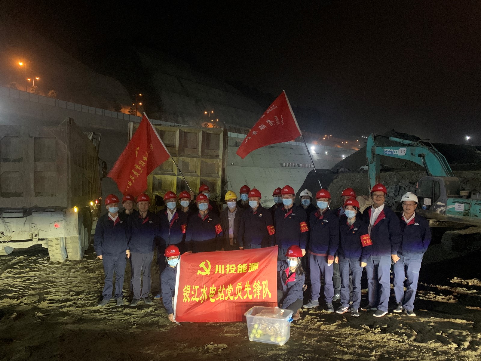 11月13日晚上22時(shí),銀江水電站CIII標(biāo)導(dǎo)流明渠項(xiàng)目工地上仍然燈火通明、機(jī)械轟鳴,為保障“11.30導(dǎo)流明渠過水”目標(biāo)順利實(shí)現(xiàn),工人們正在挑燈夜戰(zhàn)、緊張有序施工。為堅(jiān)決貫徹川投能源黨委“持續(xù)推進(jìn)‘我為群眾辦實(shí)事’實(shí)踐活動(dòng)”要求,確保大江截流目標(biāo)如期實(shí)現(xiàn),攀水電公司工會聯(lián)合機(jī)關(guān)第二黨支部組織開展了“挑燈夜戰(zhàn)保截流,凝心聚力鼓干勁”主題黨日活動(dòng),組織支部黨員、入黨積極分子及志愿服務(wù)隊(duì)17人奔赴施工一線,為深夜仍在堅(jiān)守崗位的施工及值班人員送上了熱騰騰、香噴噴的鹵雞翅、鹵蛋和香梨。攀水電公司黨總支委員、副總經(jīng)理吳巍嶼,黨總支委員、紀(jì)檢小組長、總經(jīng)理助理?xiàng)钿J及總經(jīng)理助理唐伽帶隊(duì)開展活動(dòng)。