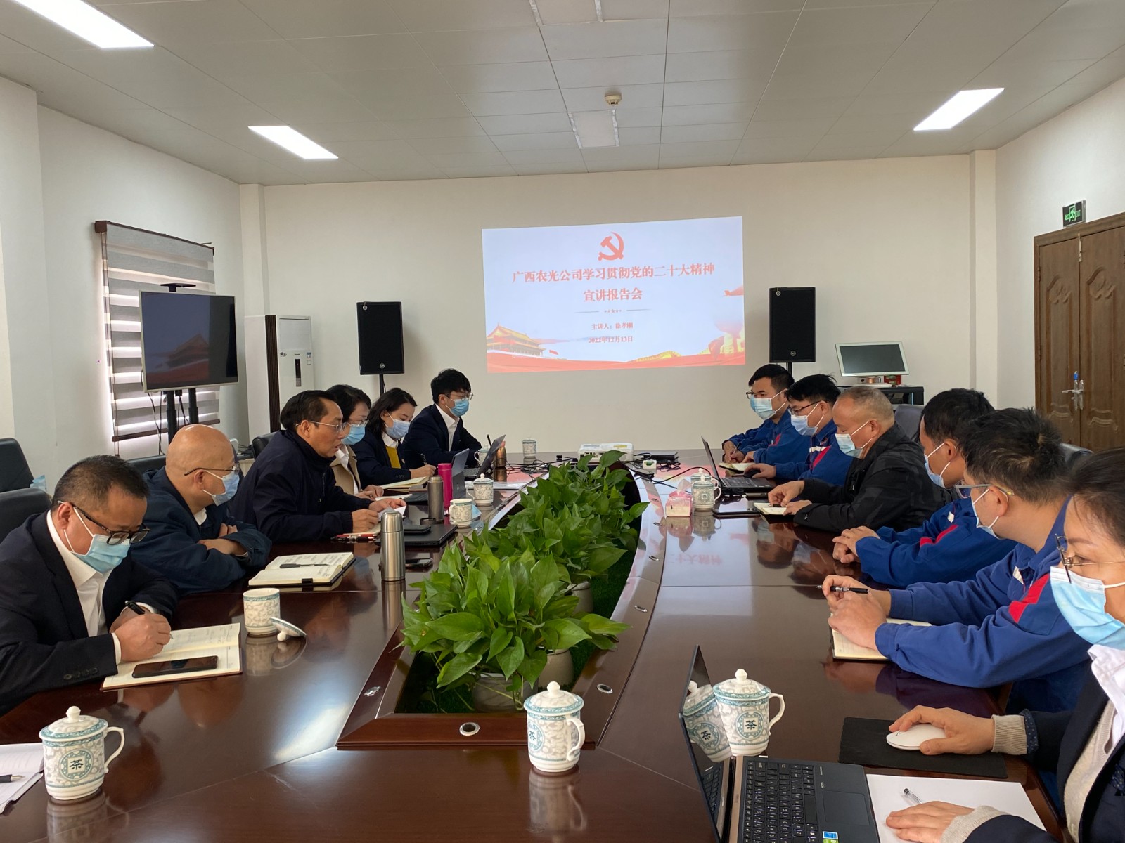 為進(jìn)一步推動黨的二十大精神走深走實,12月14日上午,川投能源副總經(jīng)理,攀水電黨總支書記、董事長,攀新能源董事長,廣西農(nóng)光董事長徐孝剛一行赴廣西農(nóng)光公司作黨的二十大精神專題宣講。攀水電黨總支學(xué)習(xí)貫徹黨的二十大精神宣講組成員、廣西農(nóng)光公司全體黨員、干部職工共20人參加宣講會,會議由攀新能源公司副總經(jīng)理楊嵐主持。