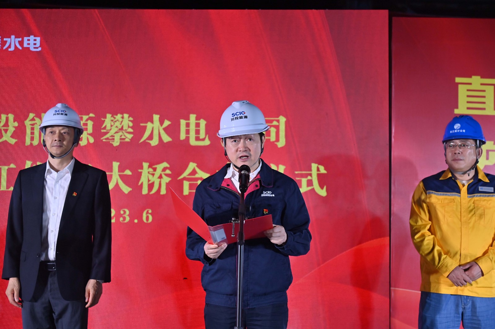 當(dāng)前正值川投能源深入開展學(xué)習(xí)貫徹習(xí)近平新時代中國特色社會主義思想主題教育的時期,攀水電黨總支以高度政治責(zé)任感扎實推進主題教育走深走實,確保學(xué)用結(jié)合取得實效。2023年6月15日,夜晚的銀江大橋施工現(xiàn)場燈火璀璨,連續(xù)幾天超過40℃高溫的攀枝花迎來了難得的涼爽天氣,攀水電公司組織開展了金沙江銀江大橋合龍儀式,川投能源黨委副書記、工會主席冉蘭平,黨委委員、副總經(jīng)理、總法律顧問楊平,川投能源副總經(jīng)理、攀水電公司黨總支書記、董事長徐孝剛出席儀式,儀式由攀水電公司黨總支副書記、總經(jīng)理吳巍嶼主持。公司相關(guān)領(lǐng)導(dǎo)及參建單位共計50余人參加儀式。