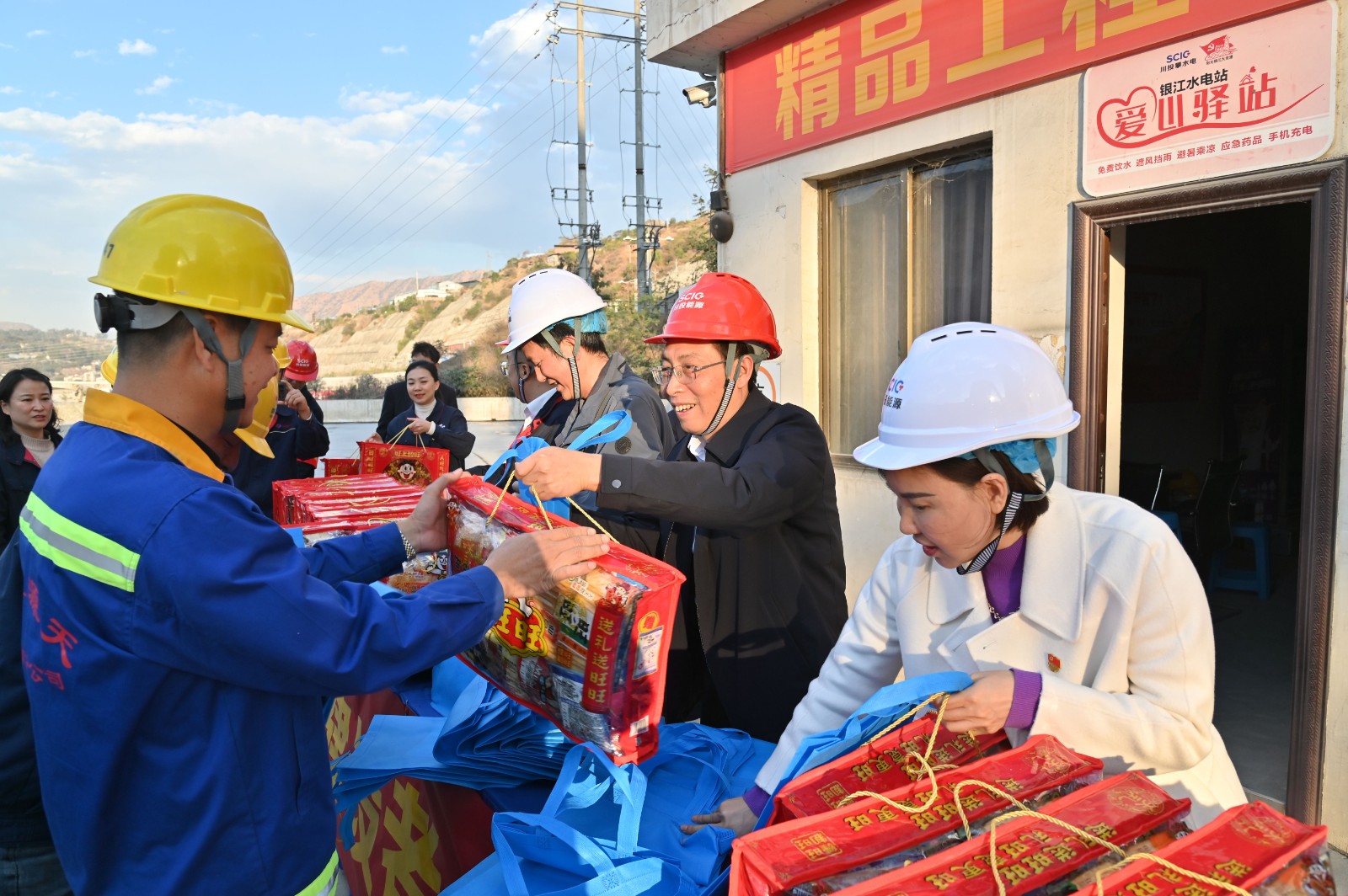 活動首先參觀了公司大黨建宣傳陣地和銀江水電站施工現(xiàn)場。在愛心驛站,黨員們?yōu)閬碜蚤L江設計院、貴陽院監(jiān)理部、水電五局項目部、水電七局項目部、廣東源天項目部等參建單位的工友發(fā)放了健康宣傳手冊、新春大禮包等慰問物品。田巨龍感慨到銀江水電站工程建設速度之快難以令人想象,囑咐工友們一定要保重身體、注意自身防護,祝福工友們平平安安、健健康康迎接新年的到來。