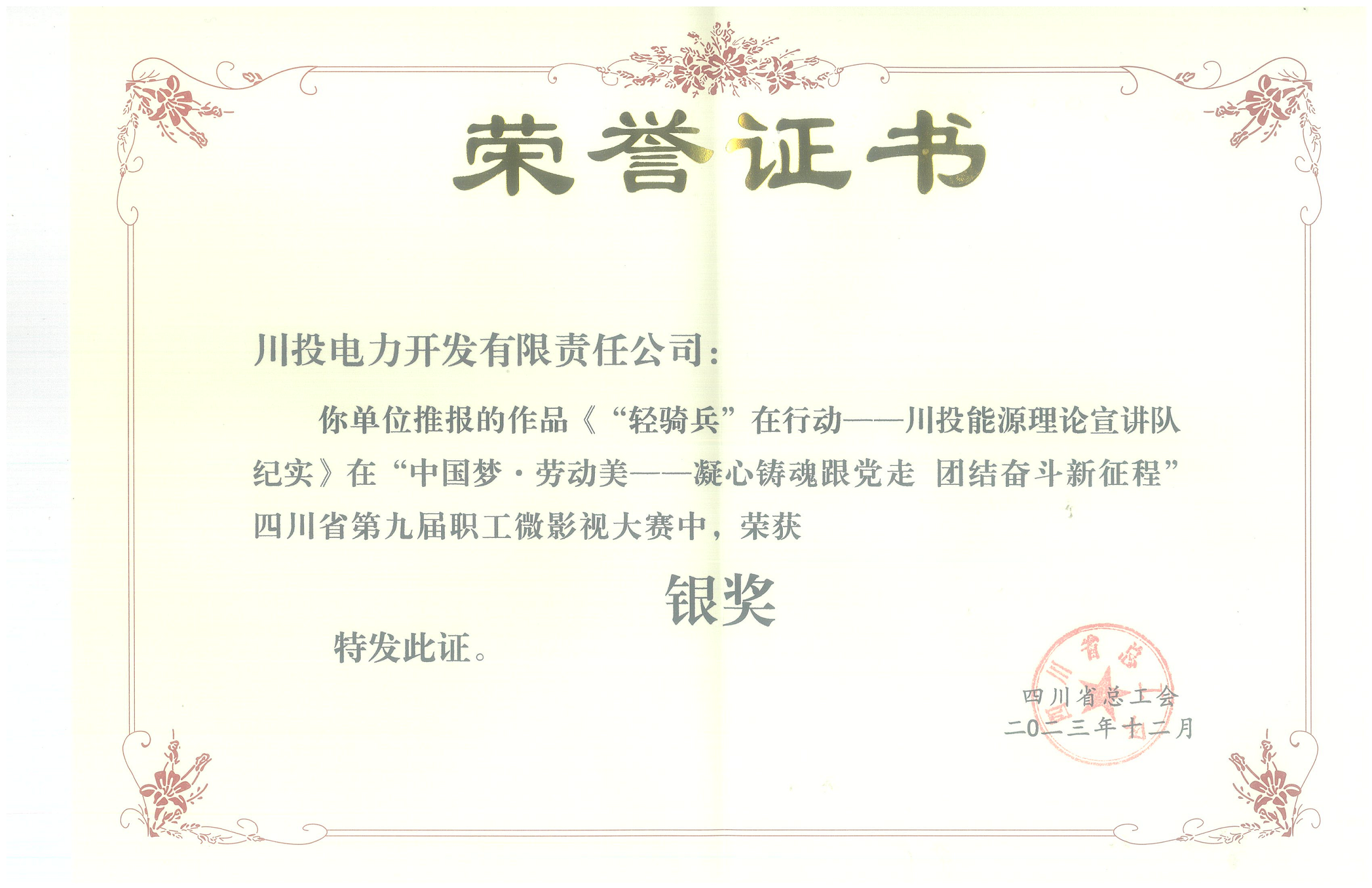 近日,“中國夢(mèng)·勞動(dòng)美——凝心鑄魂跟黨走 團(tuán)結(jié)奮斗新征程”四川省總工會(huì)第九屆職工微影視大賽活動(dòng)落下帷幕,由川投集團(tuán)工會(huì)選送、川投能源及所屬川投電力組織拍攝的微電影《“輕騎兵”在行動(dòng)——川投能源理論宣講隊(duì)紀(jì)實(shí)》在全省176部作品中脫穎而出,榮獲故事類微電影銀獎(jiǎng)。