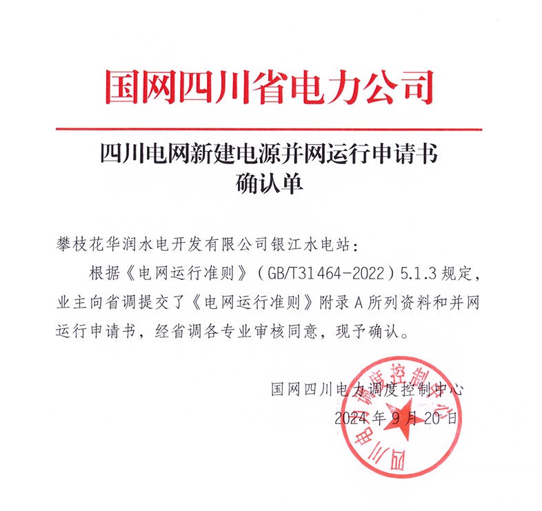 9月20日,在國網(wǎng)四川省電力公司和川投能源的指導幫助下,經(jīng)過積極對接、多方協(xié)調(diào),攀水電公司成功取得銀江水電站新建電源并網(wǎng)運行申請書確認單,標志著銀江水電站具備并網(wǎng)手續(xù)辦理的資格條件。