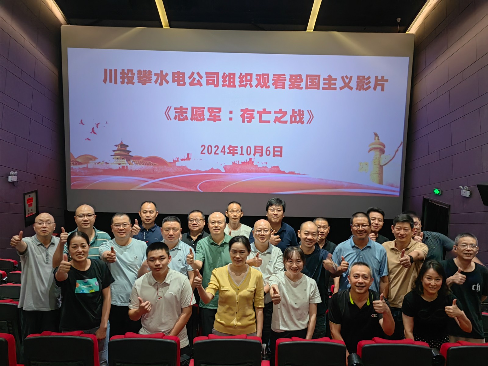 在新中國75周年華誕之際,正值攀水電公司打響年底首臺機(jī)組投產(chǎn)發(fā)電攻堅戰(zhàn)的關(guān)鍵時期,為弘揚(yáng)偉大的愛國主義精神,進(jìn)一步激發(fā)公司全體職工愛國熱情,激發(fā)推動建設(shè)銀江的磅礴力量,10月6日,公司工會組織職工50余人觀看了以抗美援朝戰(zhàn)爭為題材的愛國主義影片《志愿軍:存亡之戰(zhàn)》。