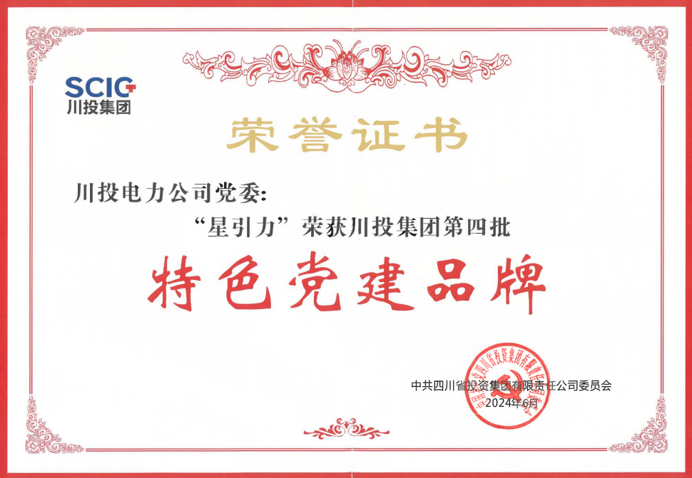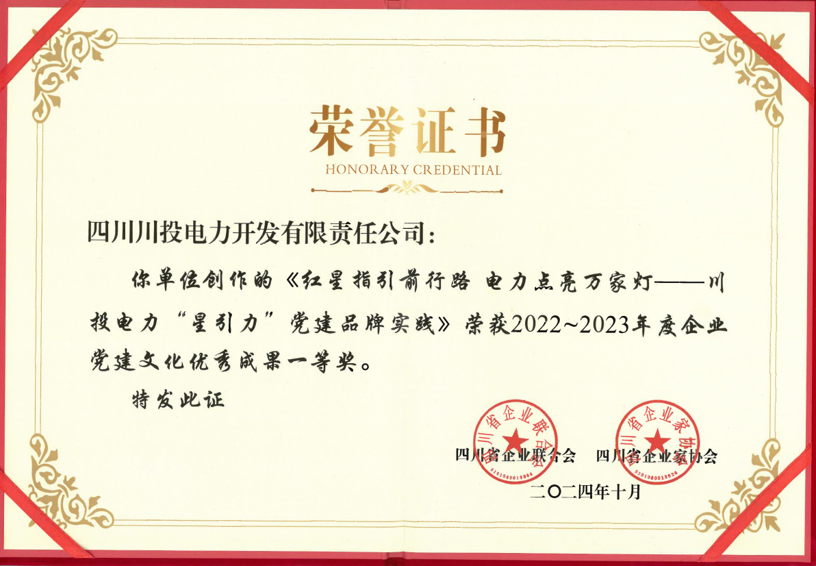 2024年以來,川投電力黨委黨建品牌“星引力”在川投能源黨委的指導(dǎo)下,先后榮獲川投集團(tuán)第四批特色黨建品牌,《中國企業(yè)報(bào)》集團(tuán)、紅旗出版社、北京大學(xué)馬克思主義學(xué)院聯(lián)合頒發(fā)的“2024年度全國企業(yè)黨建創(chuàng)新優(yōu)秀案例(黨建品牌案例)”,四川省企業(yè)聯(lián)合會、四川省企業(yè)家協(xié)會聯(lián)合頒發(fā)的“2022-2023年度黨建文化優(yōu)秀成果一等獎”等榮譽(yù)。