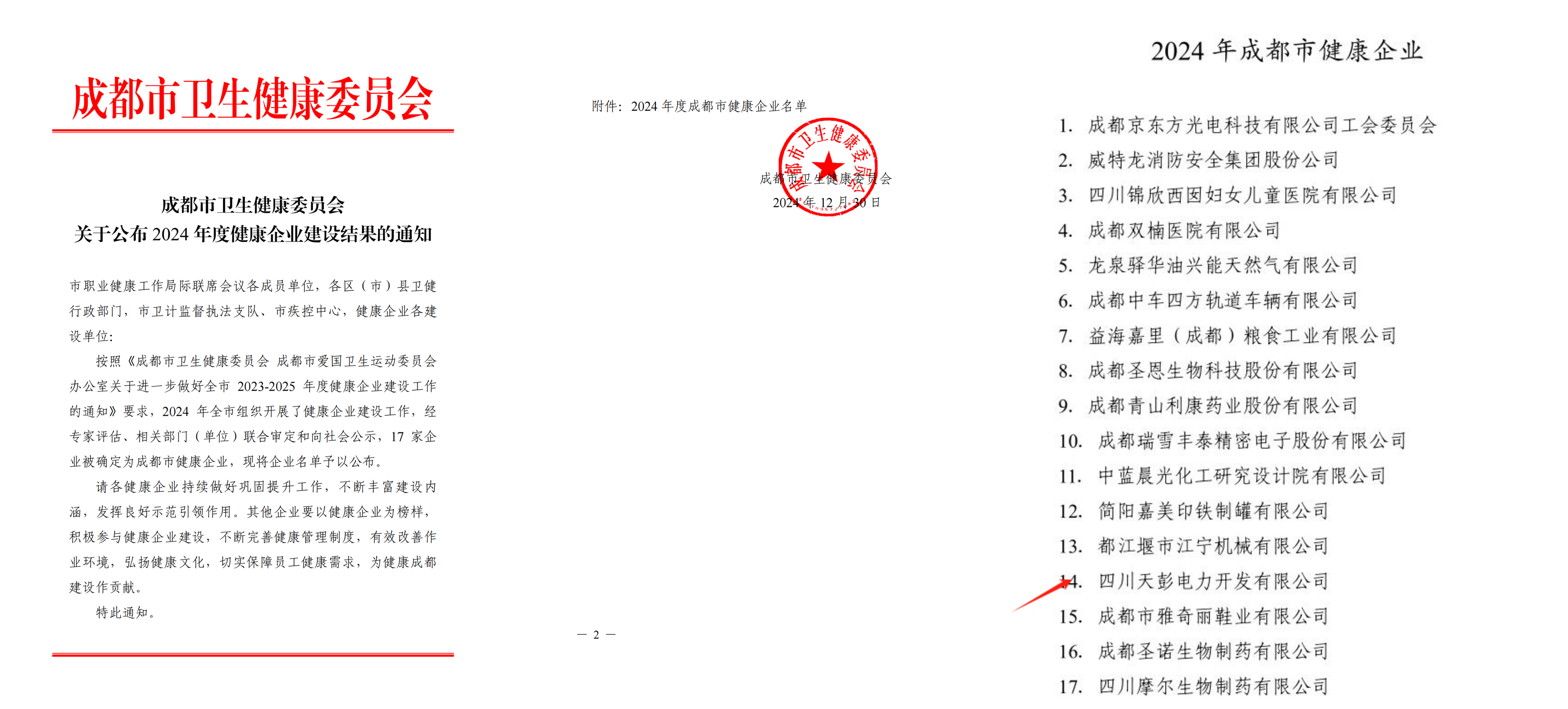 近日,成都市衛(wèi)生健康委員會(huì)公布2024年度健康企業(yè)建設(shè)結(jié)果,天彭電力公司順利通過專家組評審驗(yàn)收,被評為“2024年成都市健康企業(yè)”。