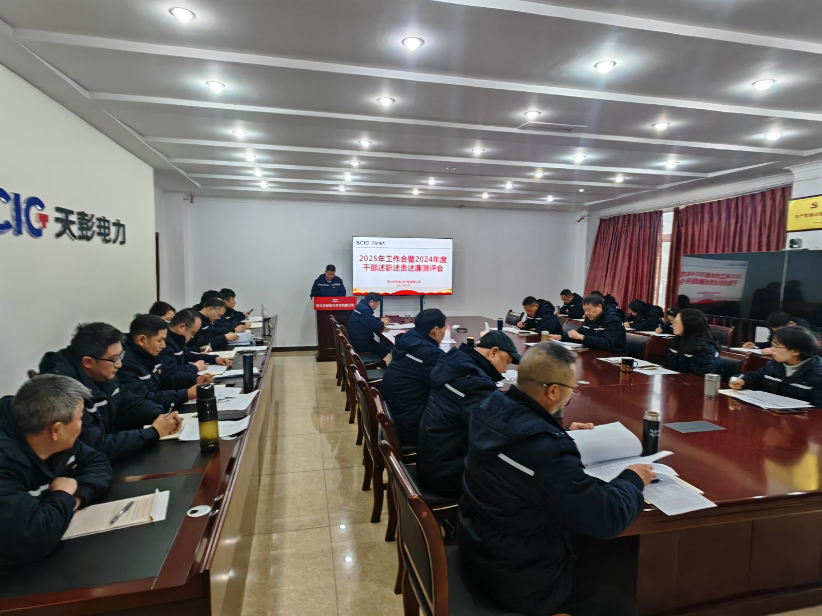 近日,天彭電力召開(kāi)2025年工作會(huì)暨2024年度干部述職述責(zé)述廉測(cè)評(píng)會(huì),傳達(dá)學(xué)習(xí)上級(jí)單位2025年工作會(huì)議精神,安排部署公司2025年重點(diǎn)工作任務(wù)。公司黨總支書(shū)記、執(zhí)行董事、總經(jīng)理劉紅兵主持,公司領(lǐng)導(dǎo)、全體中干和部分職工代表參加。