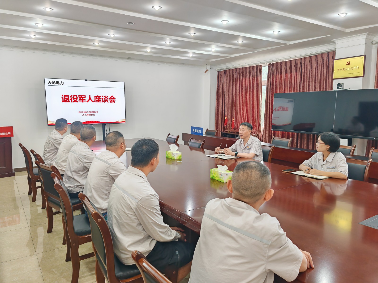 各所屬單位結合實際情況開展了“八一”建軍節(jié)走訪慰問活動。天彭電力公司、百花灘電廠召開退役軍人座談會,高奉山電廠開展“八一”建軍節(jié)主題黨日活動,槽漁灘公司組織觀看愛國主義教育電影《南京照相館》,為退役軍人送上節(jié)日祝福和慰問。所屬單位認真學習貫徹習近平總書記對雙擁工作的重要指示精神,重點了解退役軍人當前工作與生活面臨的困難。退役軍人職工代表結合自身經歷,分享了在部隊期間的成長經歷和難忘回憶,并表示永葆軍人本色,做到“退役不褪色,轉崗不轉志”,不斷提升業(yè)務能力和水平,發(fā)揮模范帶頭作用,以更高的水準應對工作中各種挑戰(zhàn)和機遇。當前正值迎峰度夏保供電關鍵期,號召全體退役軍人職工繼續(xù)發(fā)揚“特別能吃苦、特別能戰(zhàn)斗”的作風,在保電保供攻堅戰(zhàn)中當先鋒、打頭陣,以實際行動踐行水電人的初心和“退役不褪色”的莊嚴承諾。