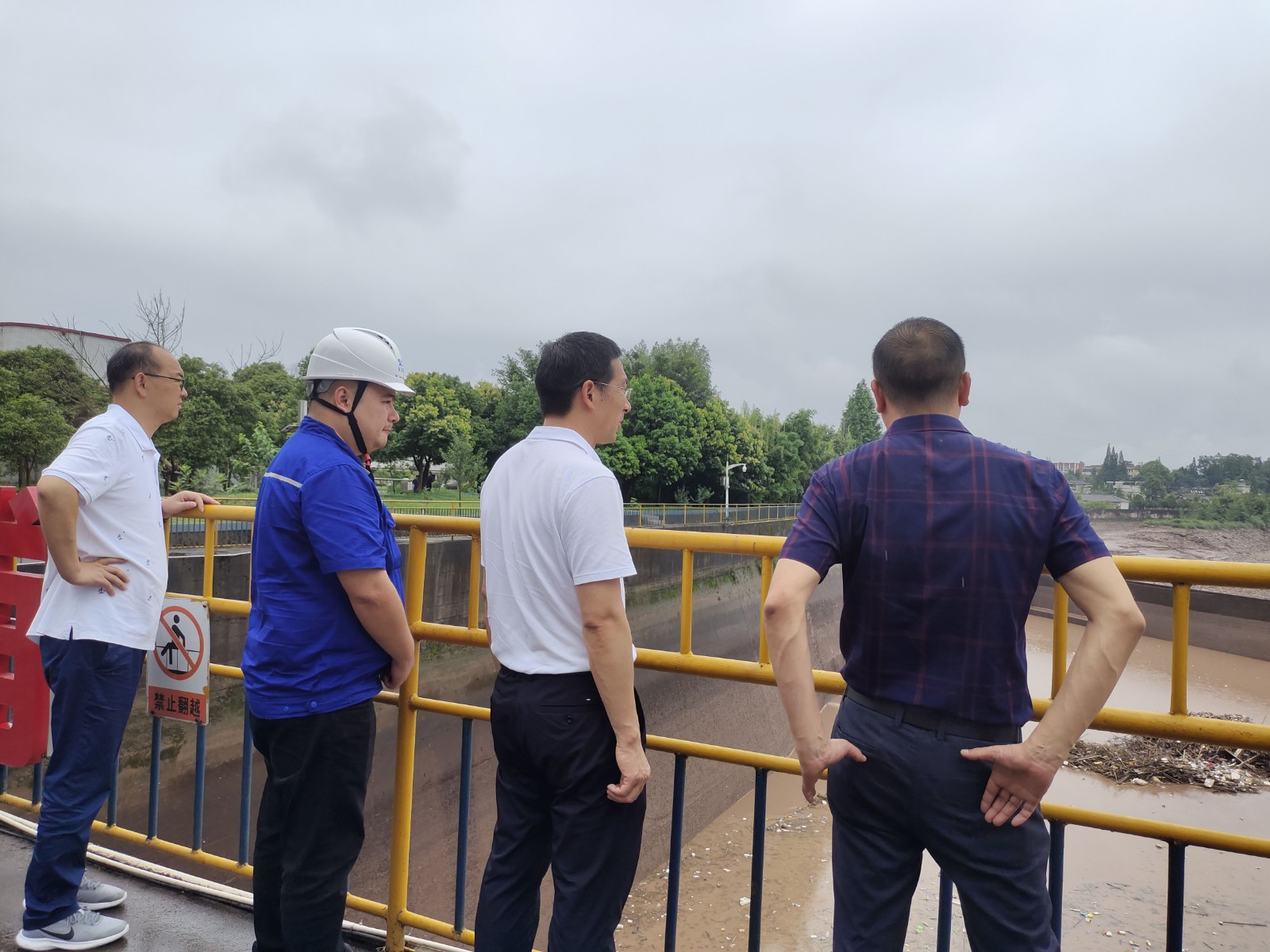 7月15日,洪雅縣委副書記、縣長周代軍一行赴百花灘電廠檢查防洪工作,電廠廠長姚磊陪同檢查。