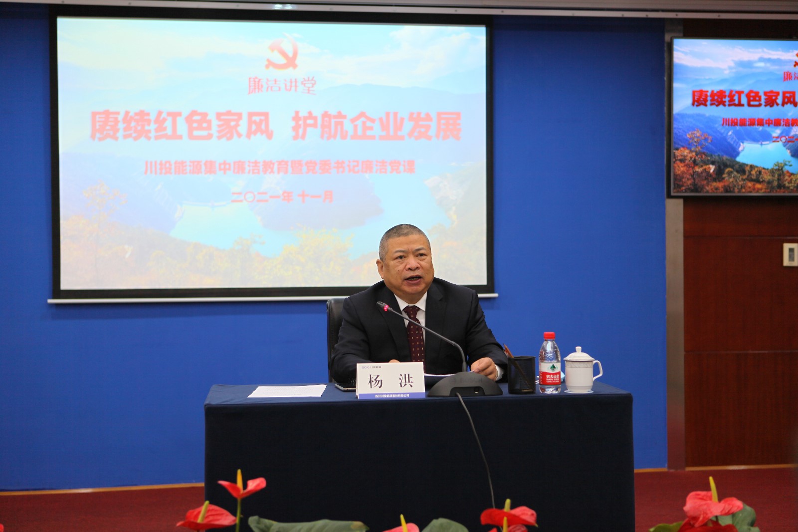 為貫徹落實(shí)中央關(guān)于全面從嚴(yán)治黨部署和要求,切實(shí)推進(jìn)公司黨風(fēng)廉政建設(shè),推動(dòng)“好風(fēng)傳家”工作落實(shí)落細(xì),2021年11月25日上午, 川投能源黨委組織召開(kāi)了2021年集中廉潔教育會(huì),公司黨委書(shū)記、副董事長(zhǎng)、總經(jīng)理?xiàng)詈橐浴百s續(xù)紅色家風(fēng),護(hù)航企業(yè)發(fā)展”為題給公司黨員干部講授廉潔黨課,并組織觀看了由中央紀(jì)委國(guó)家監(jiān)委宣傳部、中央廣播電視總臺(tái)聯(lián)合制作的電視專題片《正風(fēng)反腐就在身邊》之《嚴(yán)正家風(fēng)》。公司黨委副書(shū)記、工會(huì)主席冉蘭平主持會(huì)議。