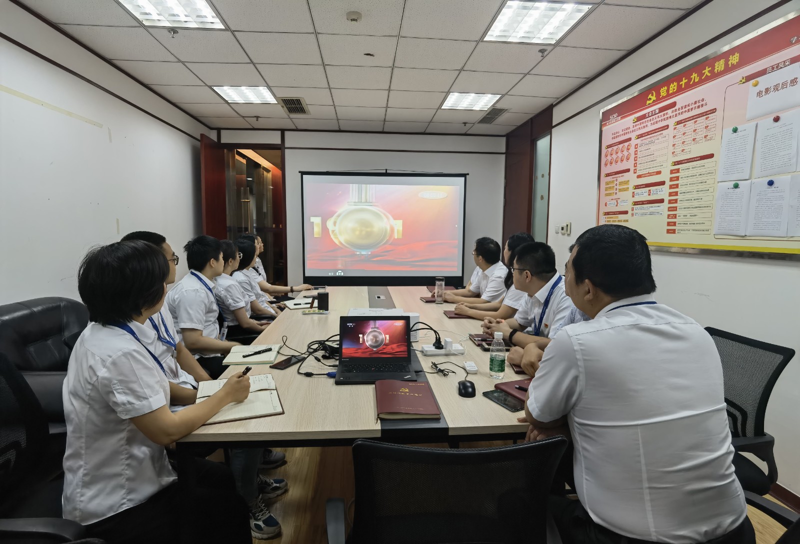 視頻中,習(xí)近平總書記鏗鏘有力的聲音深入人心,從1921到2021,中國共產(chǎn)黨帶領(lǐng)中國人民,從風(fēng)雨飄搖中一路走來,百年征程波瀾壯闊,百年初心歷久彌堅。當(dāng)《國歌》《國際歌》相繼響起的時刻,會場人員紛紛起立,跟隨激昂的旋律整齊高唱。當(dāng)回顧“四史”贊頌黨的偉業(yè)之時,會場人員滿溢出對黨的感恩和身為黨員的自豪。