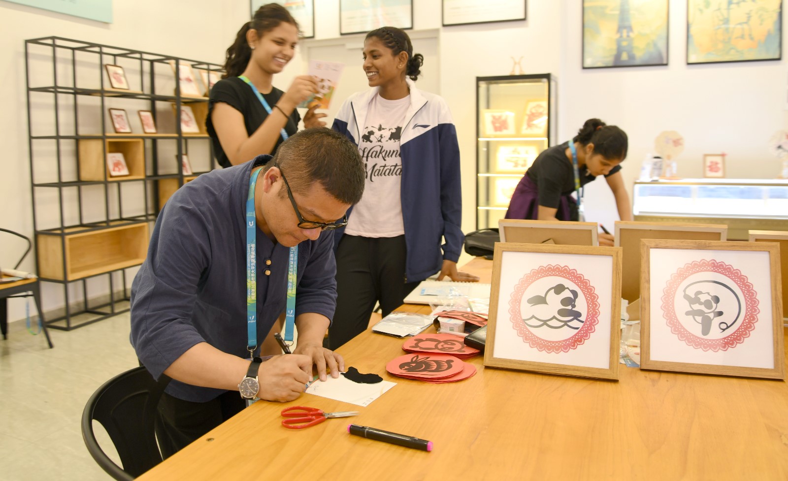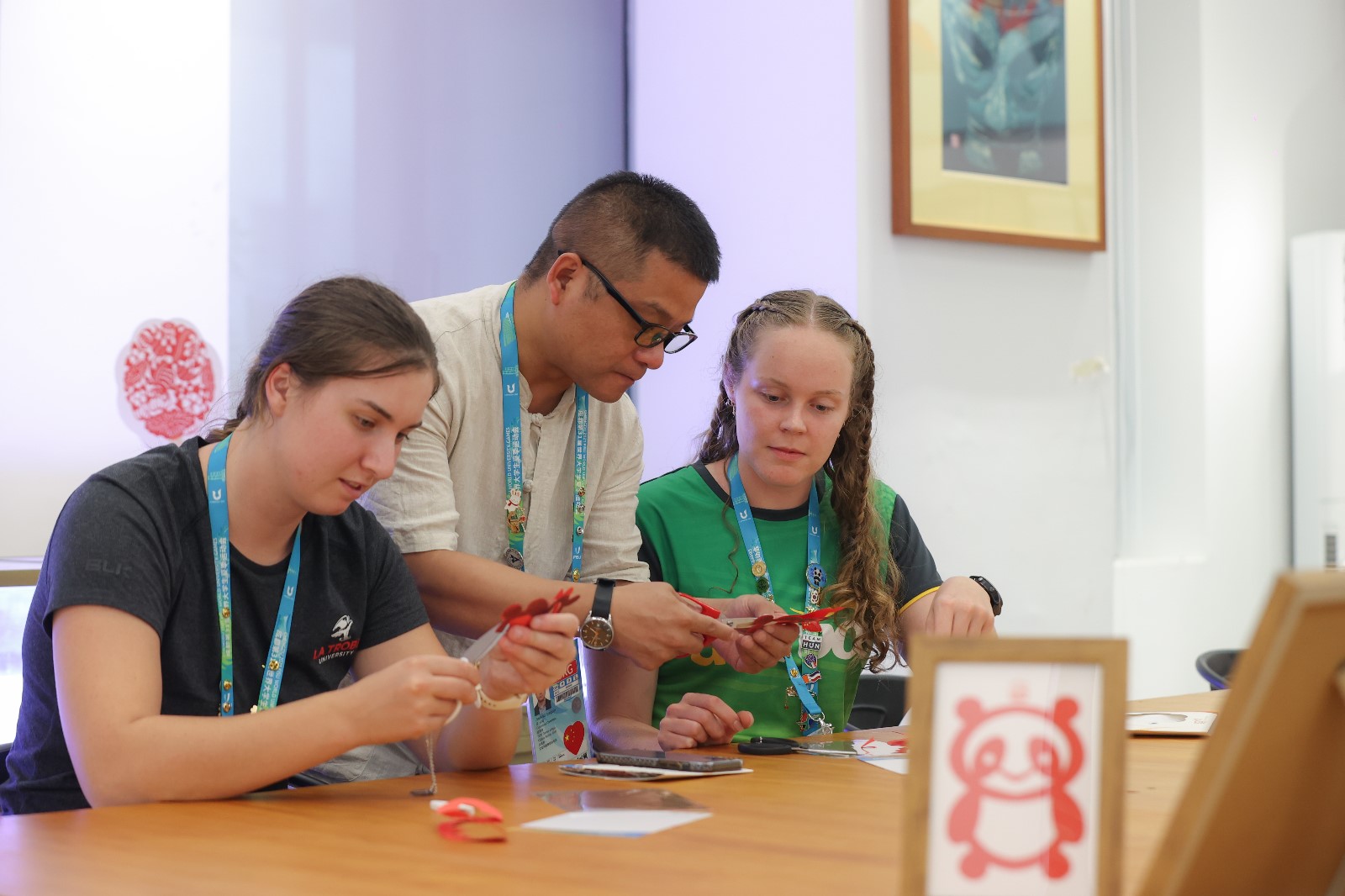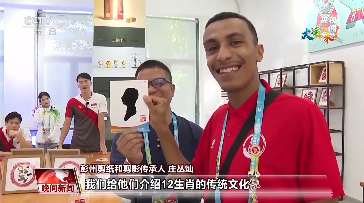 大運(yùn)會期間,成都大運(yùn)村里掀起一股“非遺熱”,引得各大媒體前來競相報道?;芋w驗(yàn)中心里,神奇的剪紙也吸引了中外運(yùn)動員們紛紛前來參與體驗(yàn)。