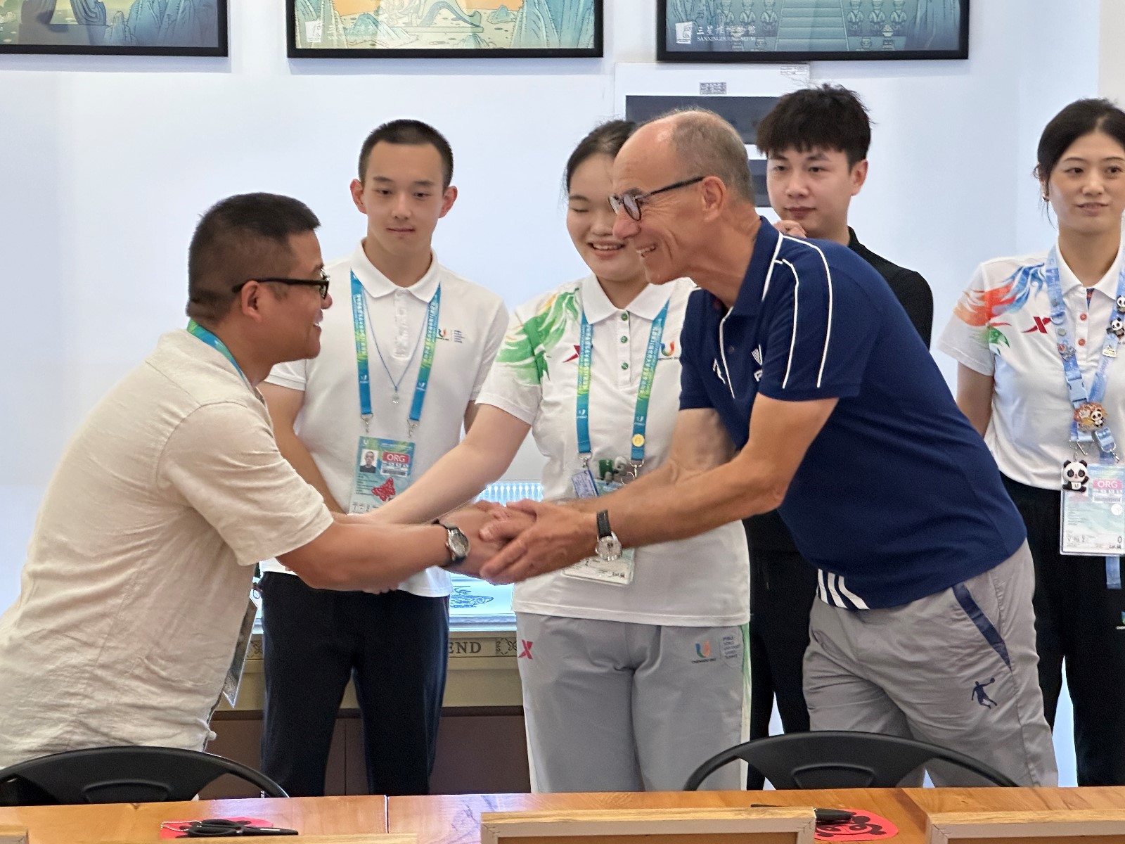 莊叢燦的剪影作品和其耐心負(fù)責(zé)的剪紙教學(xué)倍受運(yùn)動員們“點(diǎn)贊好評”的同時,也吸引了國際大體聯(lián)和各國代表團(tuán)人員前來“沉浸式體驗(yàn)”。期間,莊叢燦為國際大體聯(lián)代理主席雷諾·艾德和意大利代表團(tuán)官員彼得羅·伊瓦爾迪進(jìn)行剪紙教學(xué)和剪影留念。