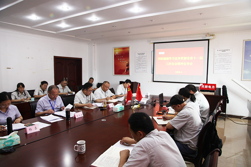 為推動(dòng)省委十一屆三次全會(huì)精神宣貫活動(dòng)深入開(kāi)展,確保省委決策部署不折不扣落到實(shí)處, 8月8日,按照川投能源黨委的統(tǒng)一部署,黨委副書(shū)記、工會(huì)主席陳長(zhǎng)江率黨群部副主任楊鑫一行赴天彭電力宣講省委十一屆三次全會(huì)精神,為天彭電力黨員干部和員工上了一堂生動(dòng)的黨課。會(huì)議由天彭電力黨總支書(shū)記、總經(jīng)理?xiàng)顫鞒?,天彭電力全體干部、黨員和員工代表共計(jì)28人參加了宣講會(huì)。