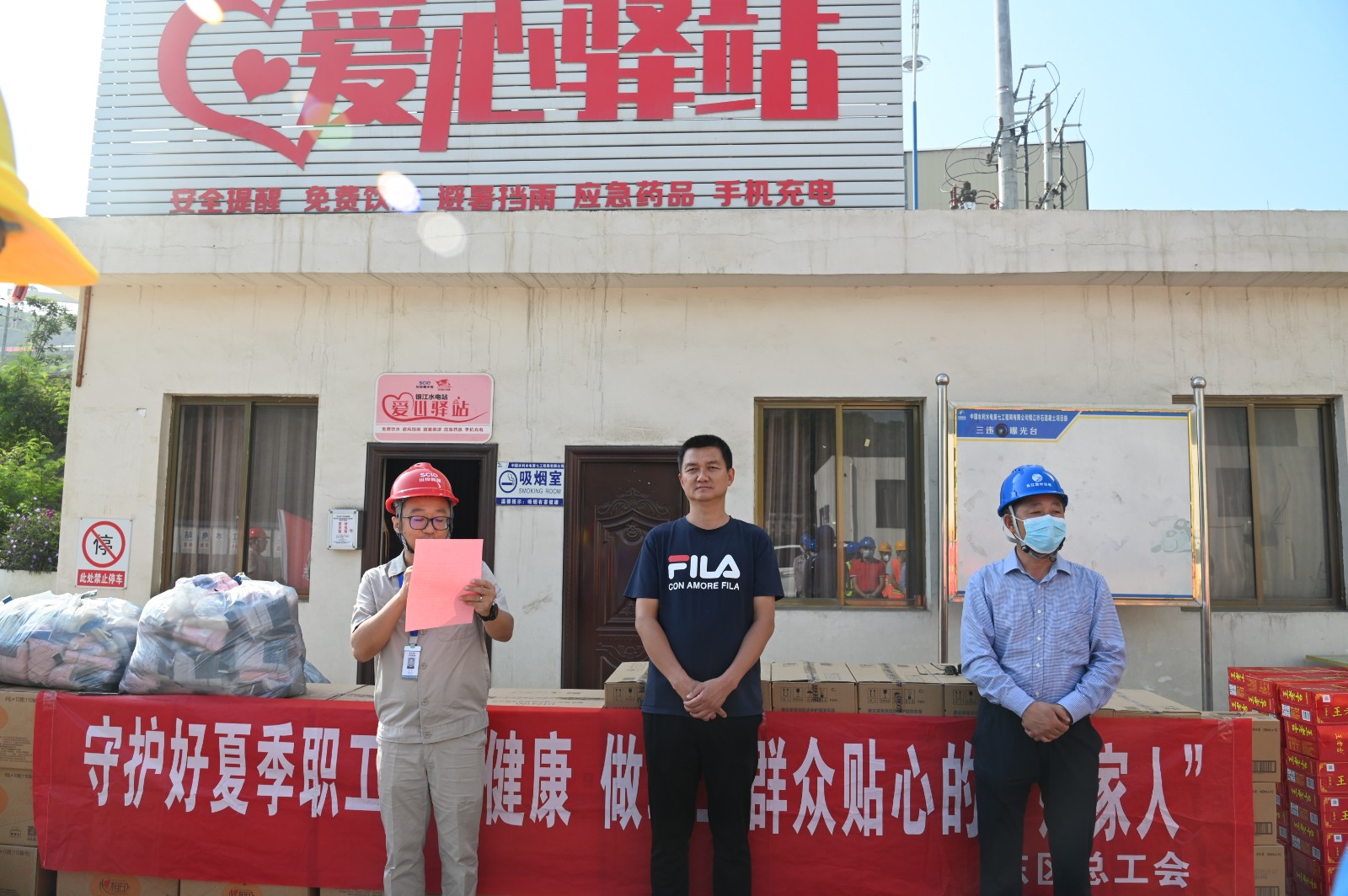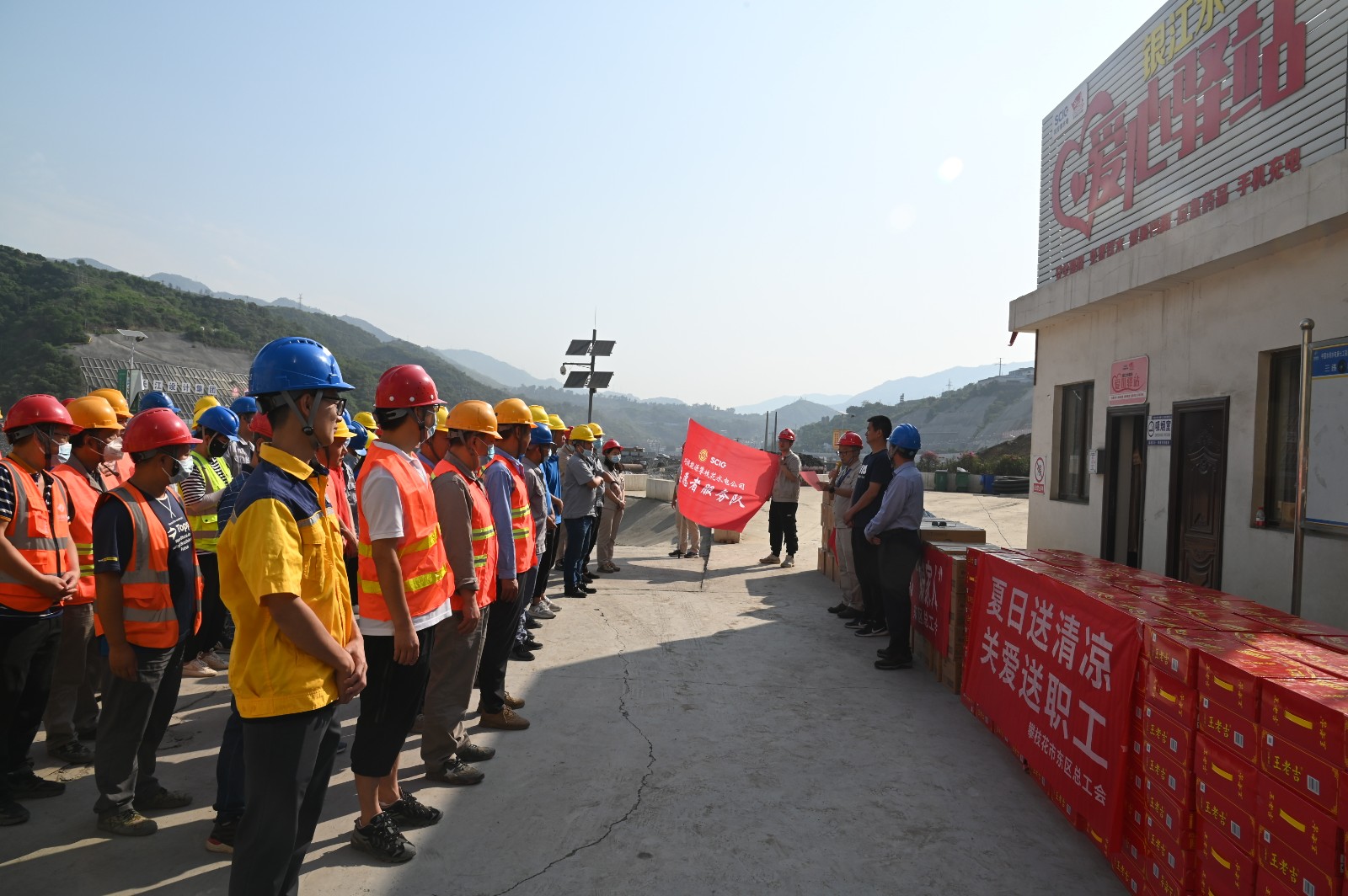 雖然是上午9點(diǎn),但盛夏的烈日已炙烤著銀江水電站工地。在銀江水電站“愛心驛站”,汪慶元首先致敬全體工友烈日下的“銀江精神”,高度贊揚(yáng)了一線建設(shè)者三年來為銀江水電站建設(shè)做出的積極貢獻(xiàn),并鼓勵(lì)他們要戰(zhàn)勝高溫酷暑等重重難關(guān),堅(jiān)守崗位完成工程建設(shè)任務(wù)。劉欣在講話中談到:東區(qū)工會(huì)心系工友,是大家的“娘家人”,希望大家保重身體,平安度夏,在落實(shí)安全防護(hù)的前提下積極工作,保質(zhì)保量推進(jìn)項(xiàng)目施工,為攀枝花的經(jīng)濟(jì)建設(shè)做出更大的貢獻(xiàn)。