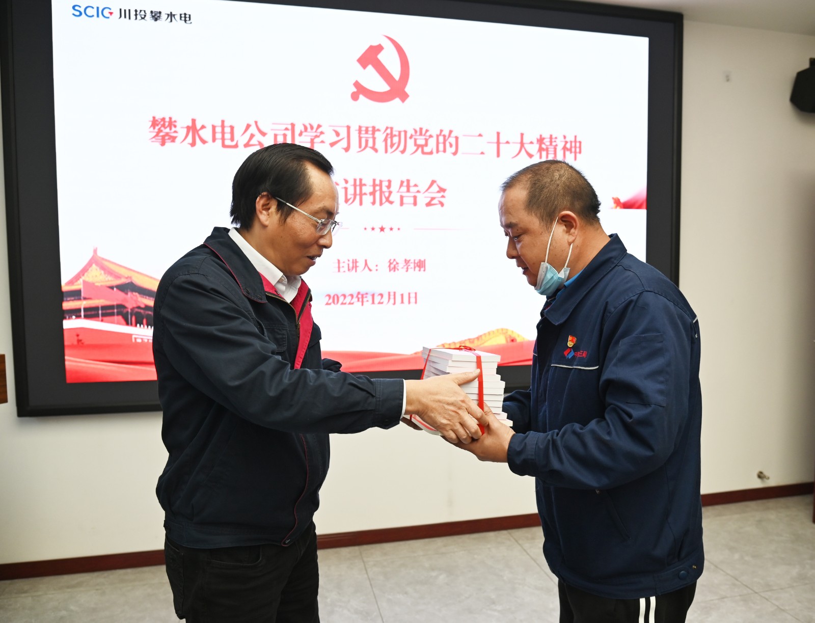 徐孝剛要求,要把廣泛開展面向職工群眾、一線工人宣講黨的二十大精神作為加強(qiáng)思想政治引領(lǐng)、廣泛凝聚民心的重要抓手,結(jié)合工程建設(shè)實(shí)際,切實(shí)確保黨的二十大精神宣講更有特色更有活力。要把學(xué)習(xí)貫徹黨的二十大精神與銀江水電站工程建設(shè)實(shí)際相結(jié)合,與工程建設(shè)重點(diǎn)任務(wù)、重要困難、重要目標(biāo)節(jié)點(diǎn)等結(jié)合起來,高標(biāo)準(zhǔn)、嚴(yán)要求推進(jìn)工程建設(shè)。宣講會(huì)后徐孝剛向水電五局項(xiàng)目部贈(zèng)送了《黨的二十大文件匯編》口袋書、《黨的二十大報(bào)告學(xué)習(xí)輔導(dǎo)百問》《二十大黨章修正案問答》等書籍。