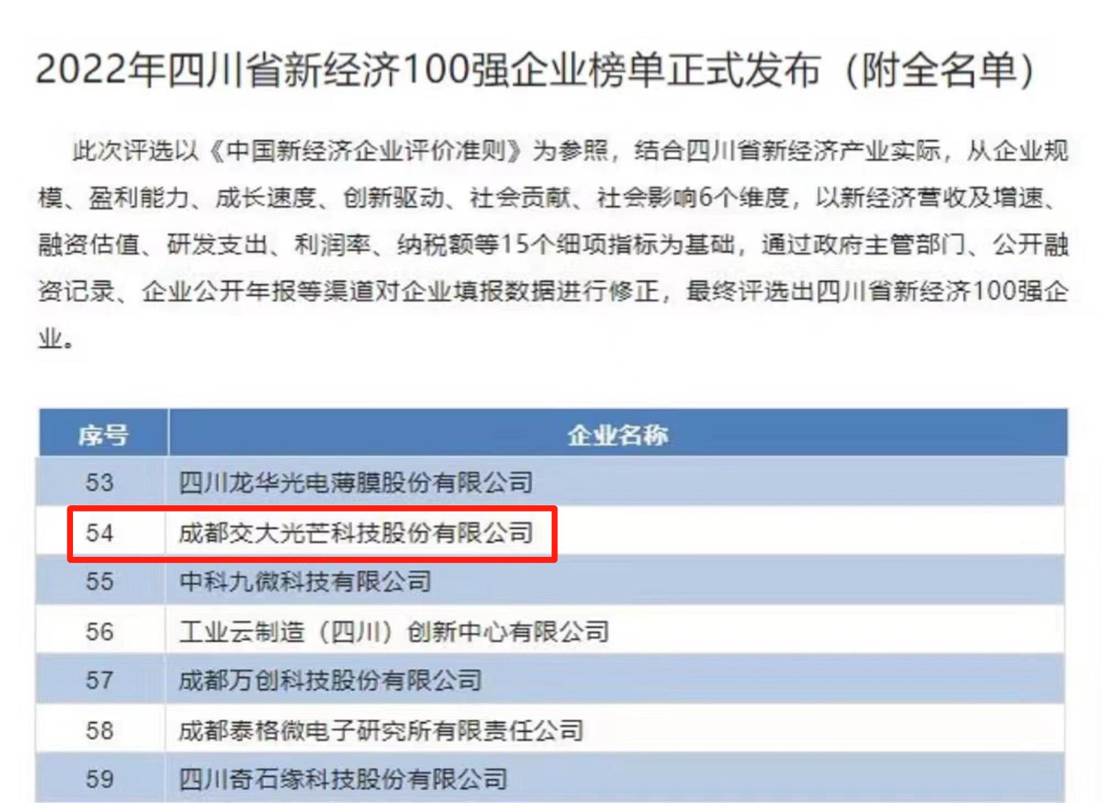 近日,四川省工業(yè)和信息化研究院發(fā)布“2022年四川省新經(jīng)濟100強企業(yè)榜單”,交大光芒成功獲評入圍,標(biāo)志其位居四川省以新技術(shù)、新產(chǎn)業(yè)、新業(yè)態(tài)、新模式為特征的新經(jīng)濟企業(yè)的前列。