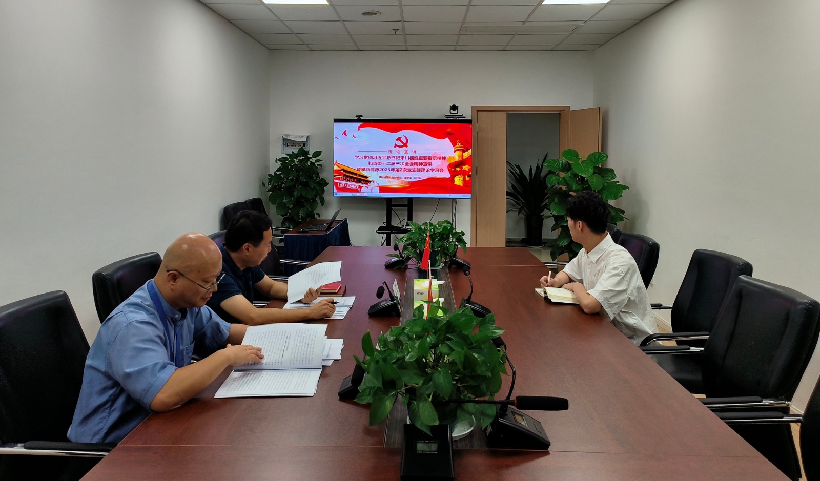 攀新能源領(lǐng)導(dǎo)班子成員及全體員工參加專題宣講,公司全體黨員參加黨支部理論學(xué)習(xí)會。