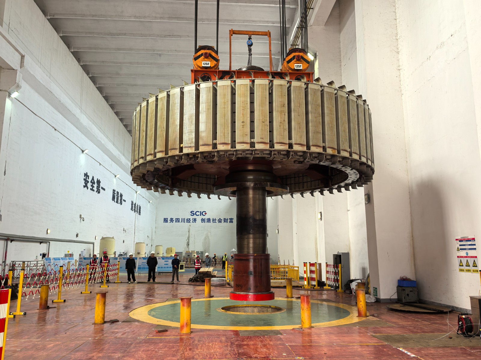 近日,經(jīng)過自主檢修團隊的連續(xù)奮戰(zhàn),川投電力所屬百花灘電廠2號發(fā)電機組轉(zhuǎn)子順利吊出,標志著此次檢修工作首個重大關(guān)鍵節(jié)點取得階段性勝利。川投電力黨委委員、副總經(jīng)理王偉,副總經(jīng)理陳云明及相關(guān)部門負責(zé)人現(xiàn)場指導(dǎo)工作。