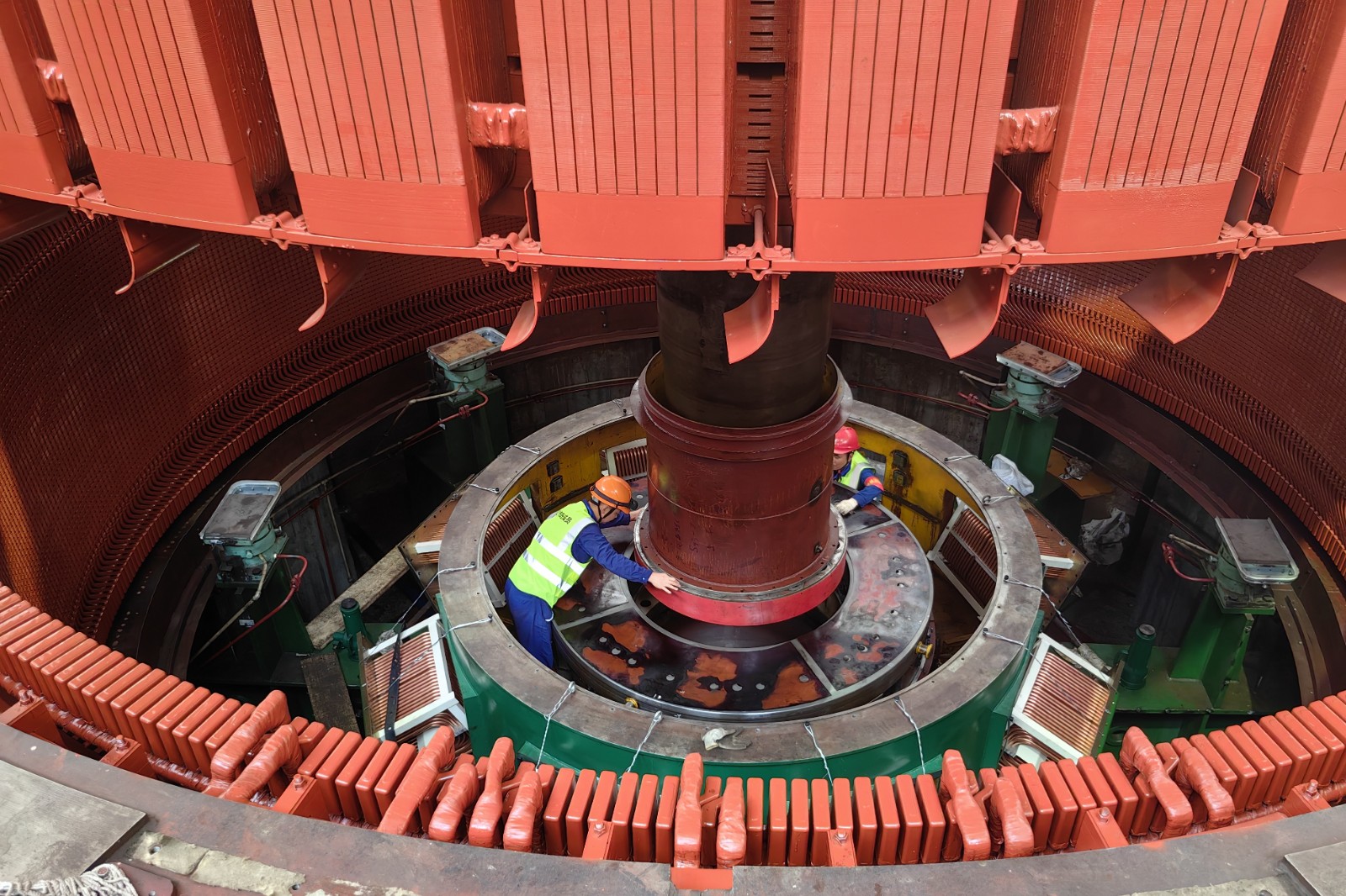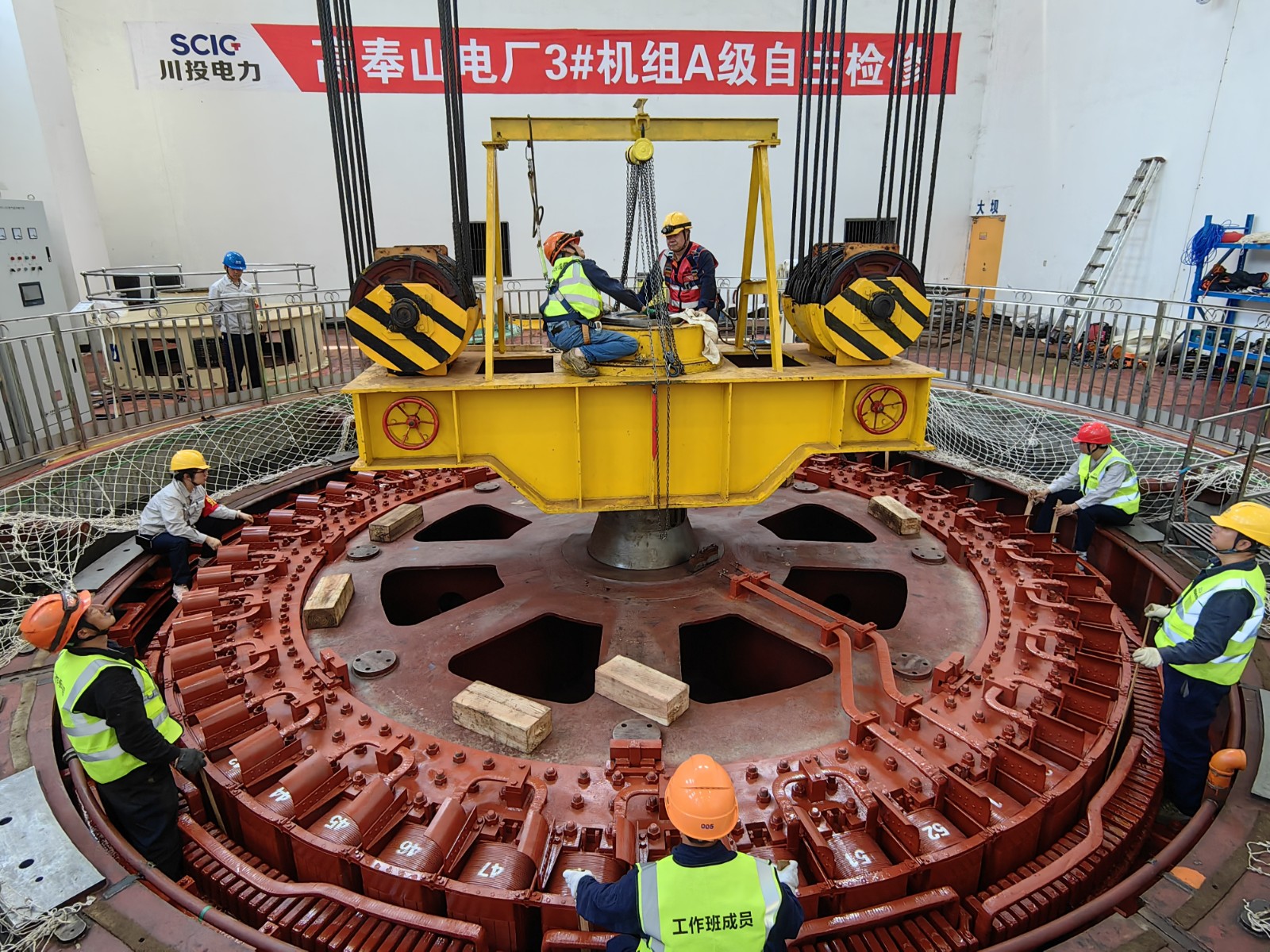 由于轉(zhuǎn)子與定子之間的間隙只有12毫米,要把這兩個“大家伙”精準(zhǔn)送回機(jī)坑指定位置并安裝好,難度系數(shù)非常高。川投電力高度重視,上下聯(lián)動,周密部署,全鏈條壓實(shí)安全生產(chǎn)責(zé)任,確保轉(zhuǎn)子回裝工作萬無一失。