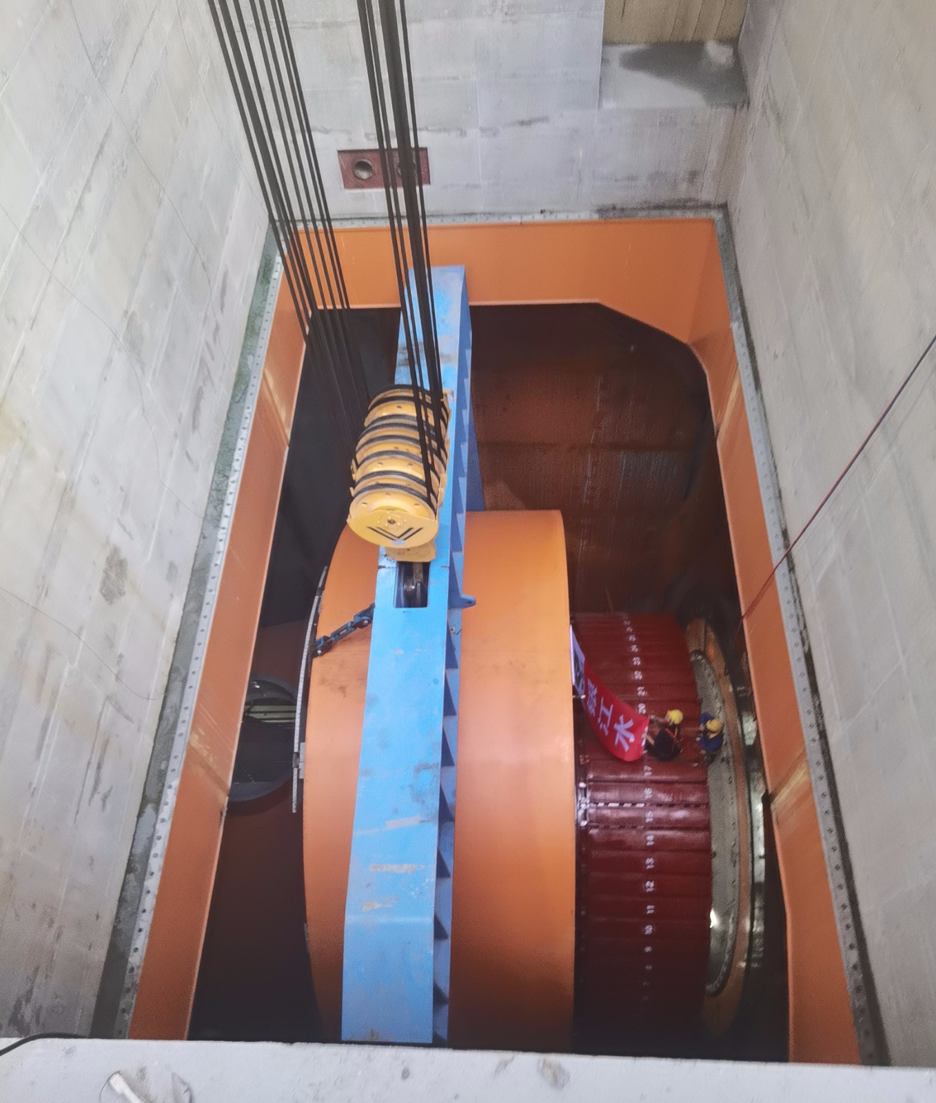 轉(zhuǎn)子與定子均是水輪發(fā)電機(jī)組核心部件,其裝配精度要求極高,本次吊裝過(guò)程堪稱機(jī)組安裝中技術(shù)最復(fù)雜、風(fēng)險(xiǎn)最高的環(huán)節(jié)之一;轉(zhuǎn)子總重約230.5噸,最大安裝直徑達(dá)8473.2毫米,由轉(zhuǎn)子支架、磁極、制動(dòng)環(huán)及轉(zhuǎn)子引線等部件精密組裝而成;定子裝配則包括機(jī)座、內(nèi)支撐、鐵芯、線棒等,總重190.5噸,機(jī)座最大外徑達(dá)10400毫米,總起吊重量高達(dá)約228噸;為確保這兩個(gè)大件的吊裝工作萬(wàn)無(wú)一失,攀水電公司協(xié)同參建各方提前周密部署,對(duì)橋機(jī)制動(dòng)系統(tǒng)、吊具及轉(zhuǎn)子、定子本體狀態(tài)開(kāi)展全維度細(xì)致檢查,同步落實(shí)現(xiàn)場(chǎng)安全技術(shù)交底,完成起吊設(shè)備調(diào)試、操作流程演練等準(zhǔn)備工作,夯實(shí)安全基礎(chǔ)。