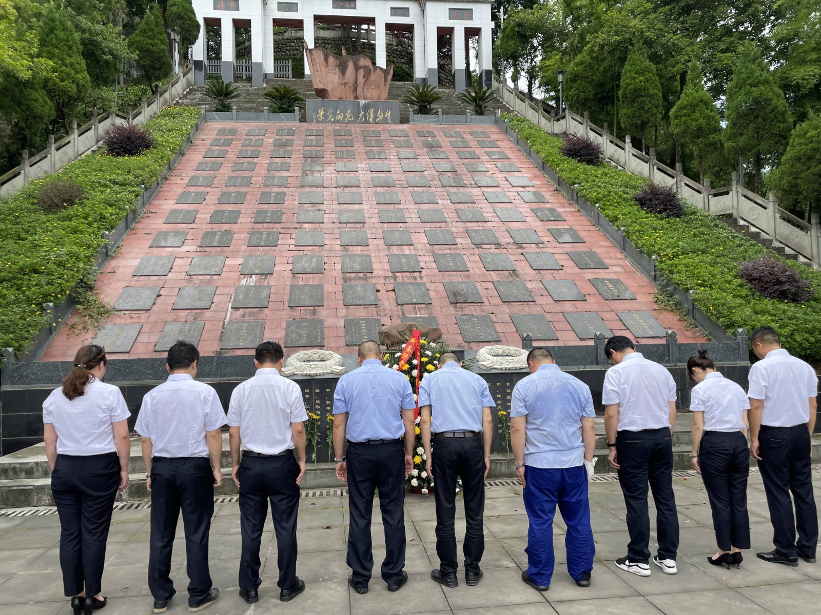 儀式后,全體黨員參觀了烈士陵園。烈士陵園內(nèi),松柏蒼翠挺拔,烈士紀念碑巍然聳立,氣氛莊嚴肅穆。天全縣烈士陵園,是為了紀念1935年10月7日至1936年2月15日中央紅軍在天全白土坎犧牲的紅軍烈士而修建的,共有316名先烈長眠于此。在300名英烈群墓旁就是修建二郎山公路時犧牲的16民烈士的公墓,二郎山隧道曾是千里川藏公路上的第一道咽喉險關(guān),素有“千里川藏線,天塹二郎山”之說,硬生生開鑿出一條道路,也付出了慘痛的代價,平均每公里就要犧牲七名戰(zhàn)士。