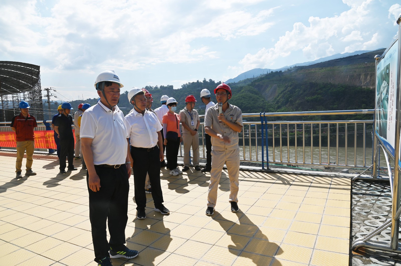 李明舟一行在銀江水電站施工變電站觀景平臺(tái)聽(tīng)取了川投能源副總經(jīng)理、攀水電公司黨總支書(shū)記、董事長(zhǎng)徐孝剛匯報(bào)了銀江水電站工程建設(shè)、防洪度汛、安全文明施工、環(huán)保水保等方面工作情況。
