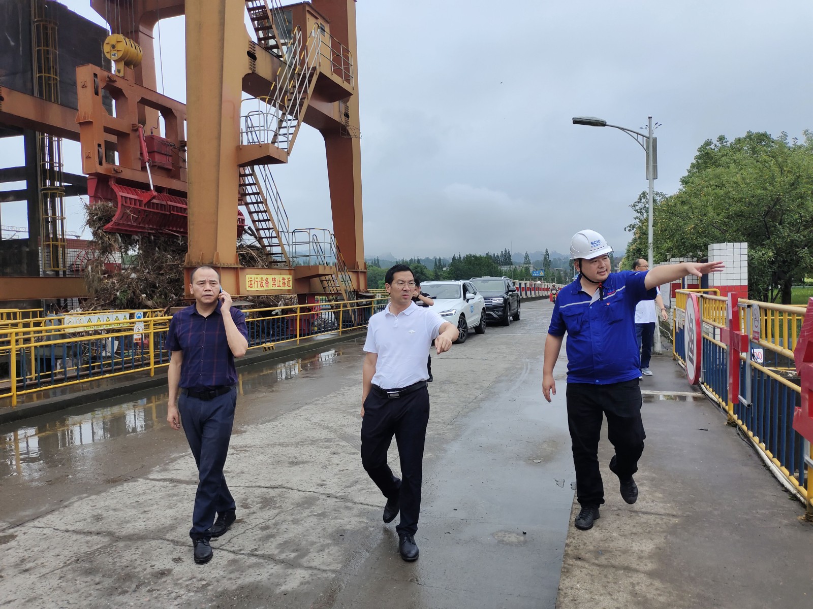 7月15日,洪雅縣委副書記、縣長周代軍一行赴百花灘電廠檢查防洪工作,電廠廠長姚磊陪同檢查。