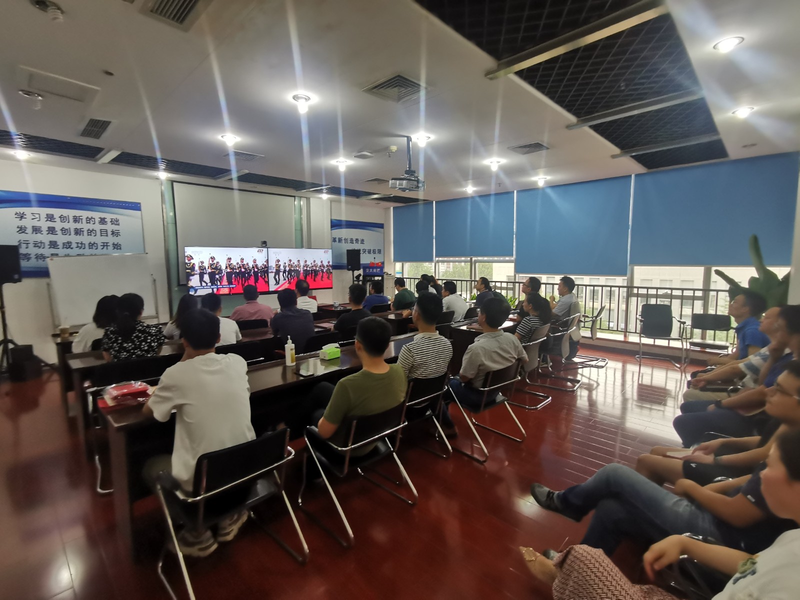 視頻中,習(xí)近平總書記鏗鏘有力的聲音深入人心,從1921到2021,中國共產(chǎn)黨帶領(lǐng)中國人民,從風(fēng)雨飄搖中一路走來,百年征程波瀾壯闊,百年初心歷久彌堅。當(dāng)《國歌》《國際歌》相繼響起的時刻,會場人員紛紛起立,跟隨激昂的旋律整齊高唱。當(dāng)回顧“四史”贊頌黨的偉業(yè)之時,會場人員滿溢出對黨的感恩和身為黨員的自豪。